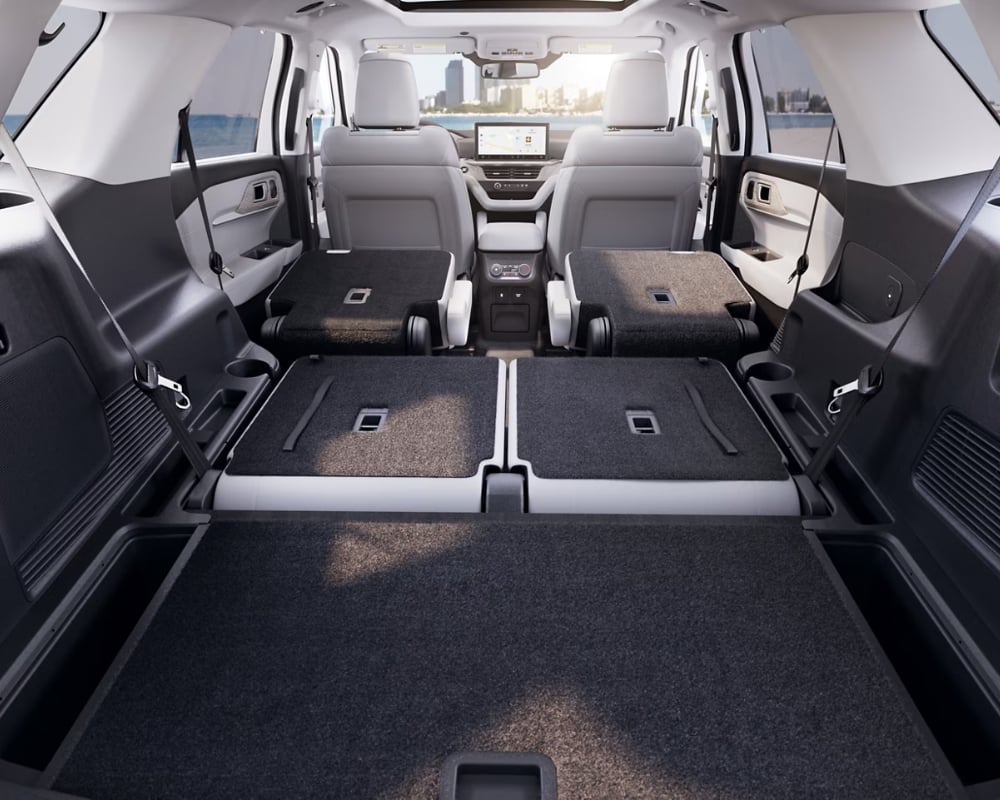 The Explorer's interior design prioritizes function over form, but its comfortable cabin is updated with new interior colour schemes and more soft-touch materials. The dashboard is redesigned to provide more space for front passengers. The 2025 Ford Explorer has up to 2,486 litres of cargo space with all rear seats folded down, or 1,356 litres behind the second row. It also has 461 litres of space behind the third row.